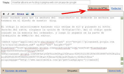 Pero si lo que queremos es insertar en la entrada del blog todas las imágenes del álbum en forma de diapositivas, entonces hay que pulsar en la frase Incrustar proyección de diapositivas.